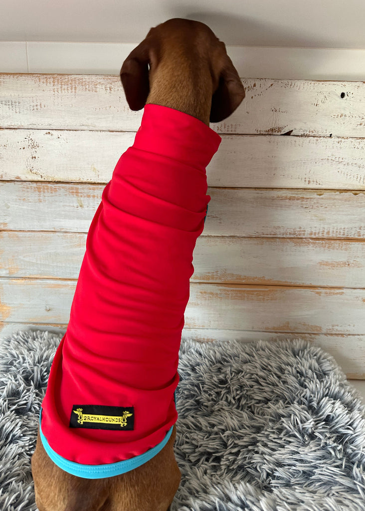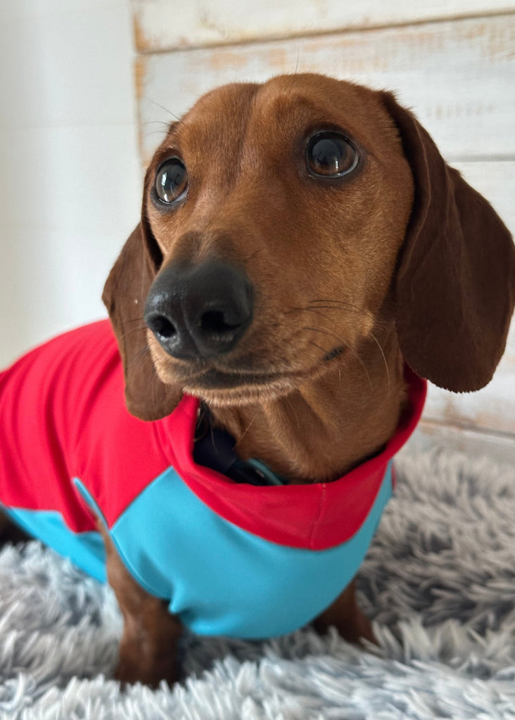 The bright red and light blue design adds a fun, playful splash of colour while helping prevent sunburn on sensitive backs and bellies. Designed and tested by dachshund owners, for dachshunds because we know just how hard it is to find gear that actually fits!
