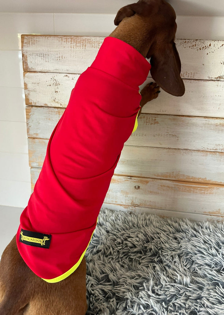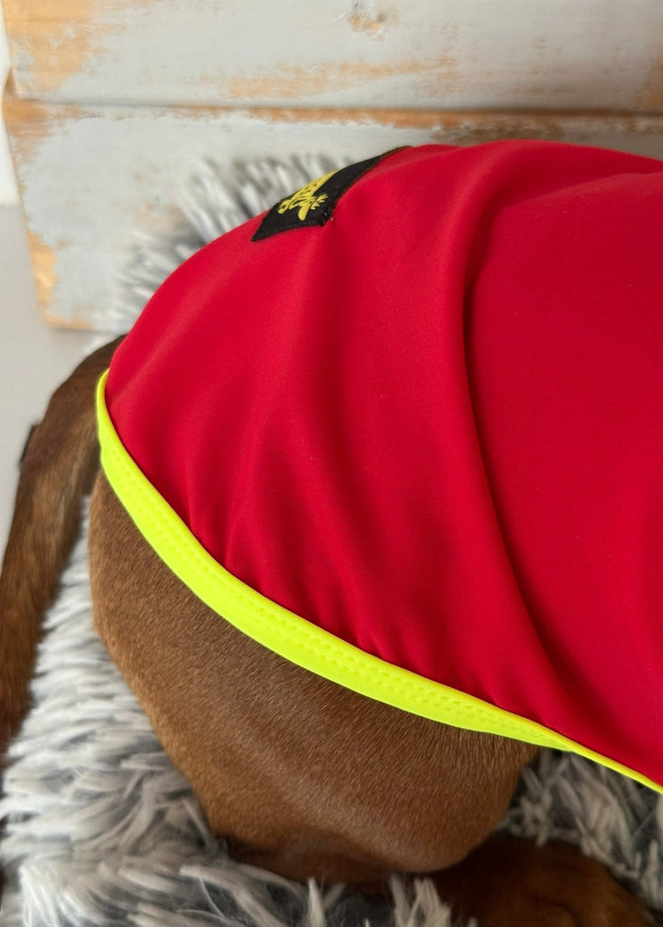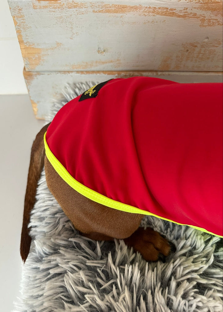 The vibrant red and high-vis yellow design adds a bold, energetic splash of colour while helping to prevent sunburn on sensitive backs and bellies. Designed and tested by dachshund owners, for dachshunds because we know just how hard it is to find gear that actually fits!