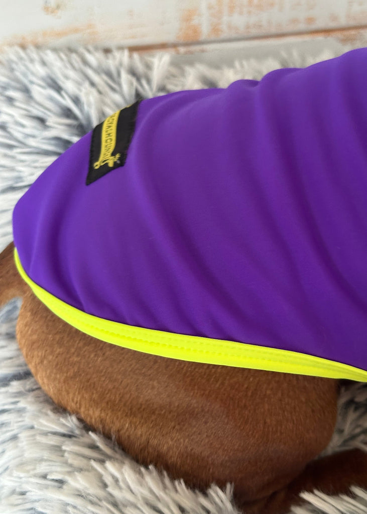 The bold purple and high viz yellow design adds a fun, eye-catching pop of colour while helping prevent sunburn on sensitive backs and bellies. Designed and tested by dachshund owners, for dachshunds because we know just how hard it is to find gear that actually fits!