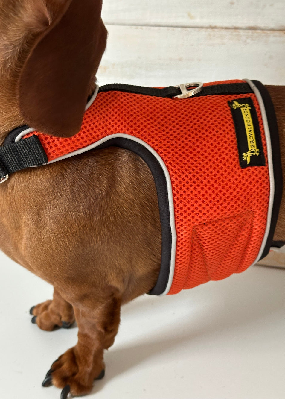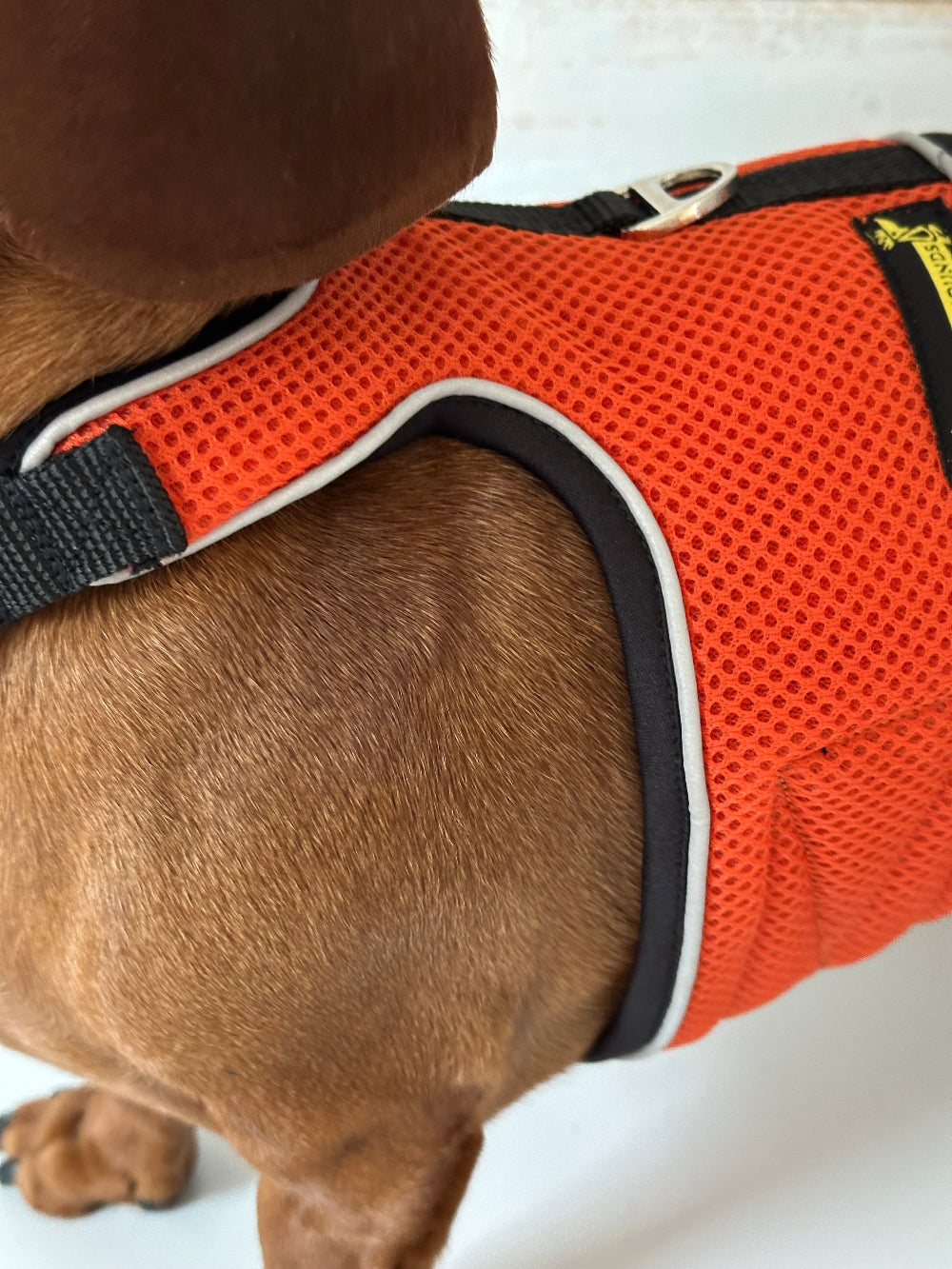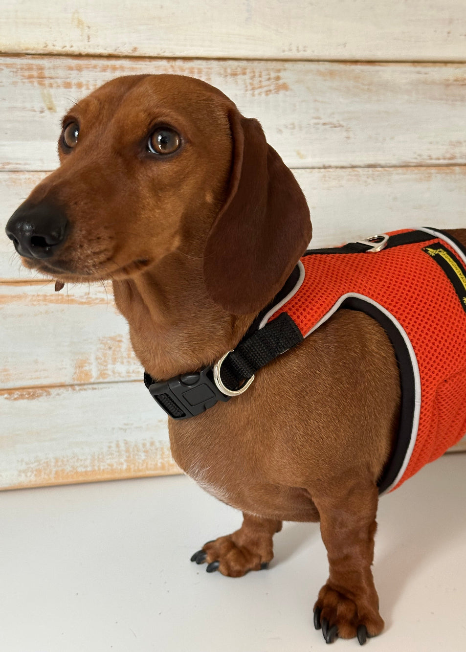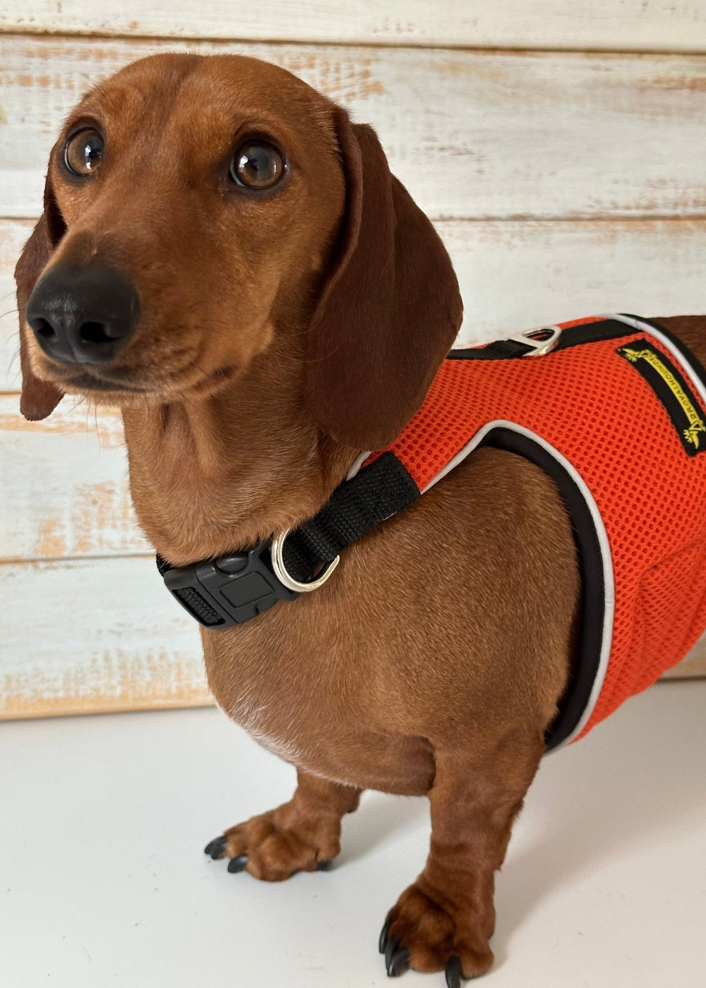 Bright. Bold. Full of personality. The Burnt Orange OxyMesh Hug Me Harness™ is made for dachshunds and small dogs who love to stand out. Inspired by golden sunsets and autumn adventures, this harness blends comfort, safety, and a pop of playful colour perfect for pups with big energy and even bigger style.
