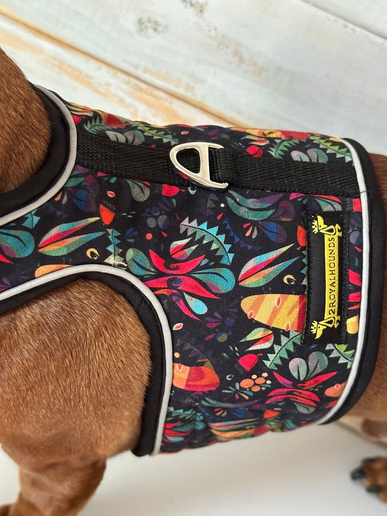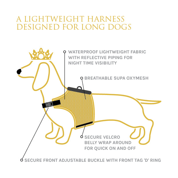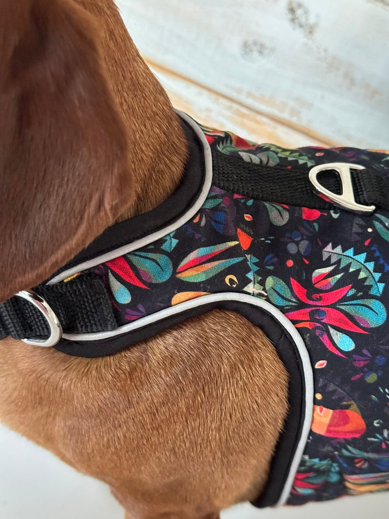 Crafted with OxyMesh™ Technology for lightweight breathability and finished with a premium cotton canvas outer, this botanical design keeps your dachsie cool, comfy and ready for adventure. Reflective piping improves safety in low light, while our dachshund-exclusive ergonomic fit supports long bodies and sensitive spines. Durable, easy to clean and secured with a 40kg-rated buckle, it blends practicality with natural elegance.