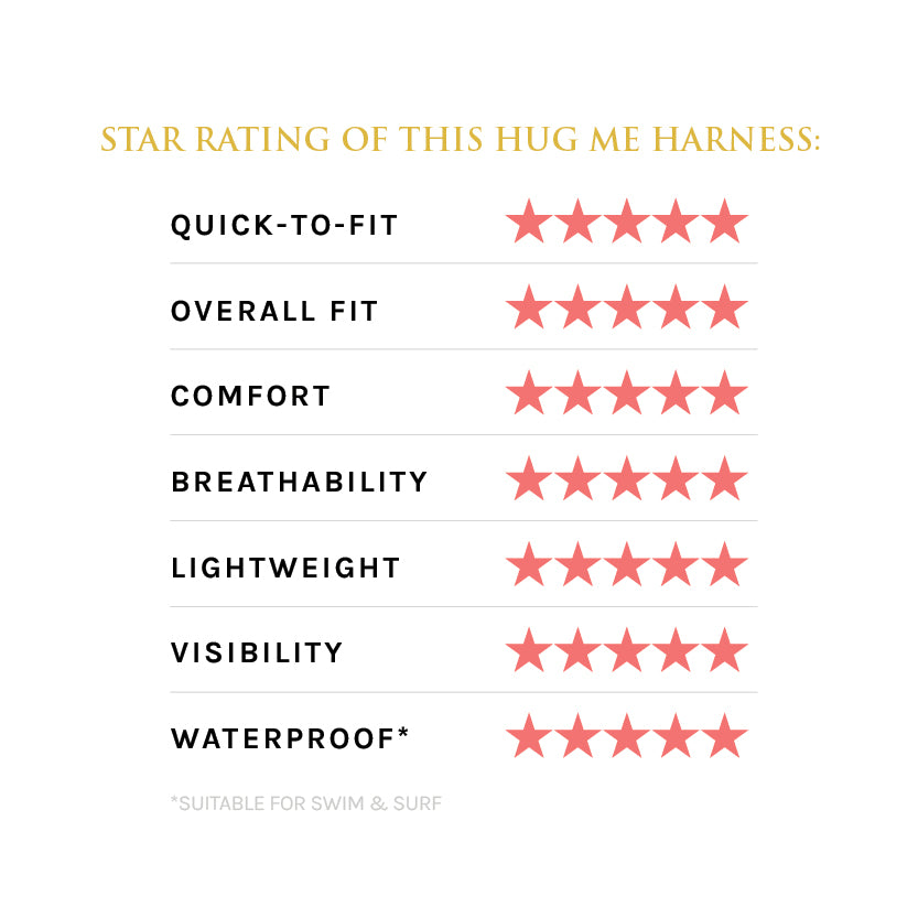 - No neck measurement is needed — the neck area of our Hug Me Harness™ is fully adjustable.