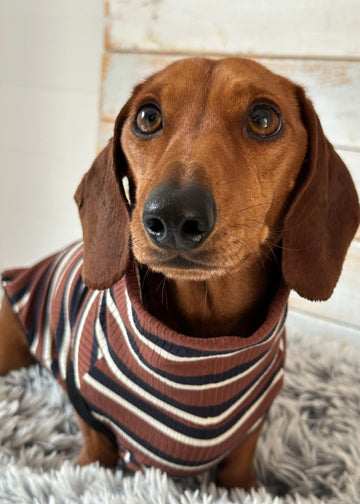 Perfectly tailored for dachshunds, the cut hugs long bodies while leaving short legs free for easy movement. The deep pecan tones paired with bold stripes create a look that’s both refined and eye-catching the perfect balance of class and confidence.