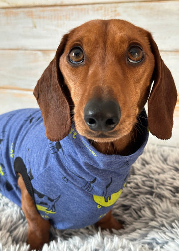 Tailored for dachshunds, the fit hugs long bodies while letting short legs move freely. The bold cobalt blue base with its neon green dachsie graphic brings a playful, street-inspired edge that turns every walk into a runway.
