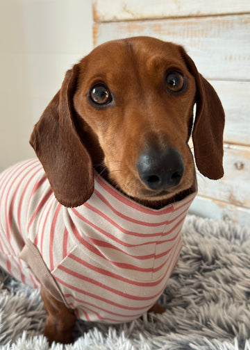 Earthy, warm, and timeless, the Royal Classic Tee – Pebble & Paprika Stripe is a cosy essential for your dachshund’s wardrobe. Crafted from luxuriously soft organic European cotton jersey, this lightweight tee is breathable, gentle on sensitive skin, and perfect for pups with allergies, offering a soft barrier against irritants like grass.