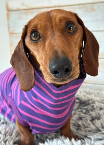 Specially tailored for dachshunds, the fit flatters long bodies while giving short legs total freedom of movement. The bold blend of violet and petunia stripes makes a statement that is as elegant as it is eye-catching.