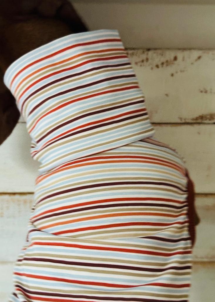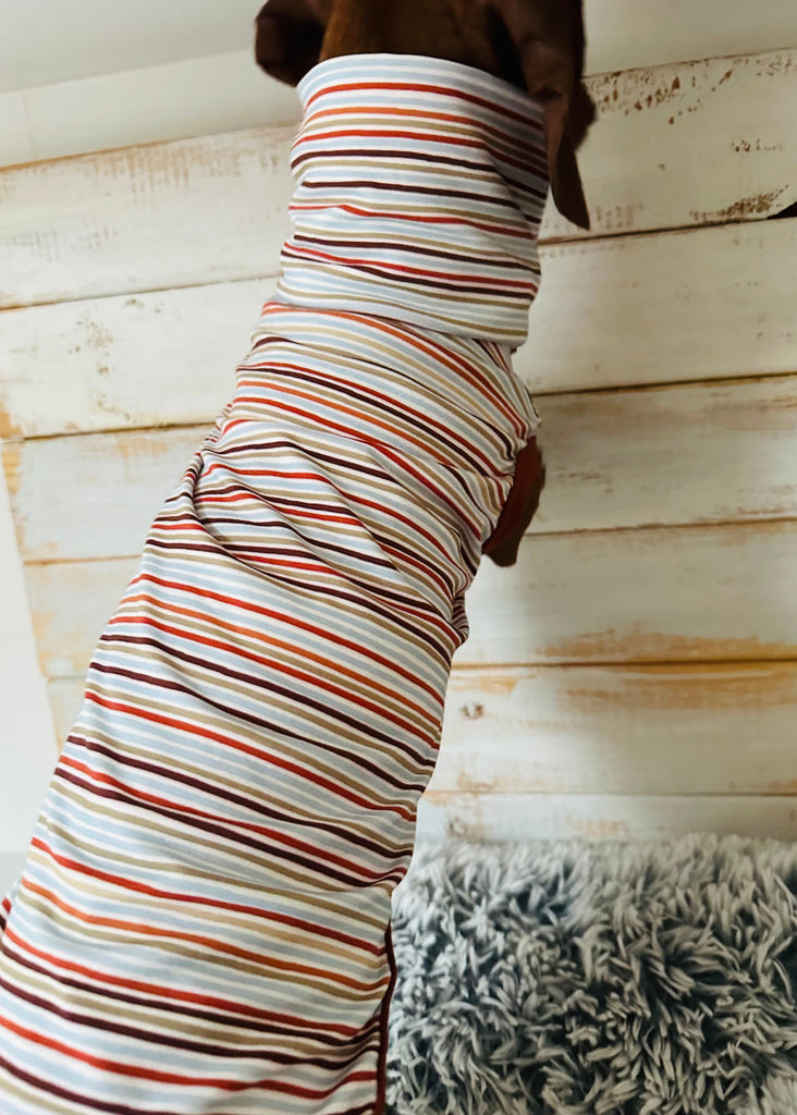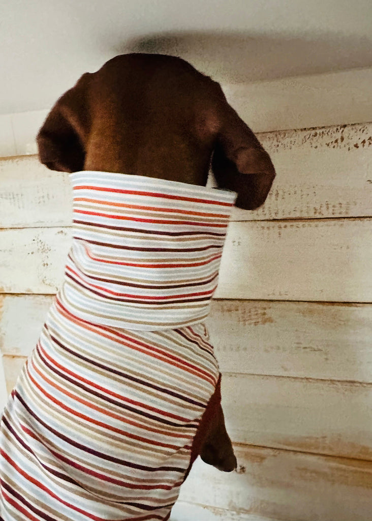 Specially designed for dachshunds, the tailored fit flatters long bodies and gives short legs complete freedom of movement. The earthy autumn stripe palette brings a timeless charm, making this tee as stylish as it is practical.