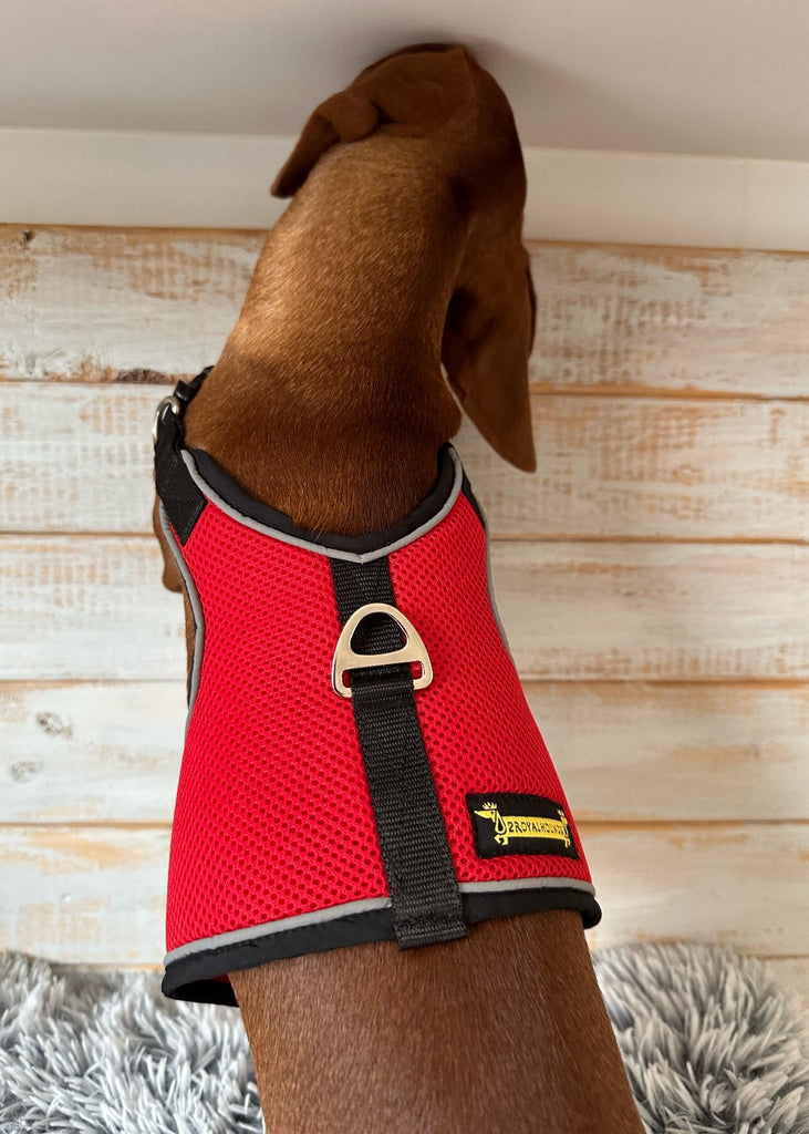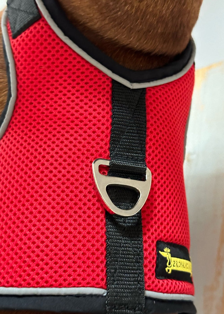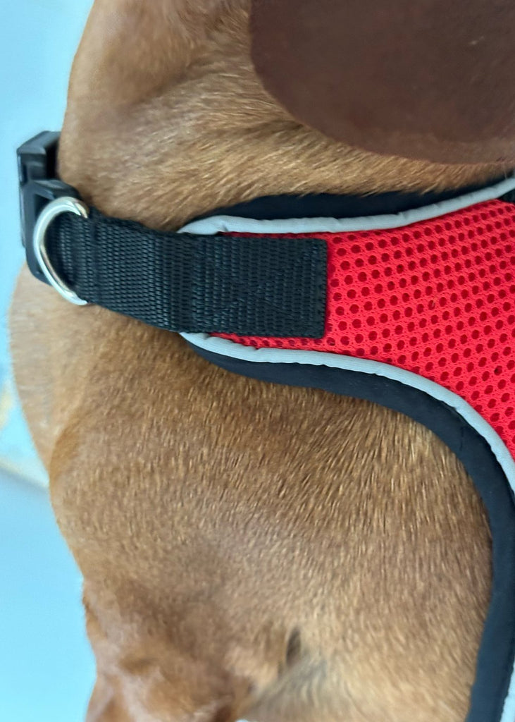 Stylish & Safe: This red mesh dog harness isn’t just eye-catching – it’s complemented by reflective piping to keep your pup safe.