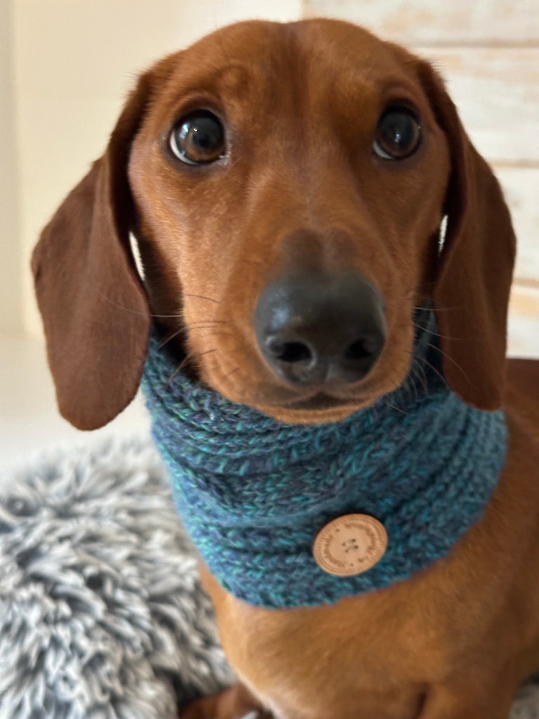 Introducing our beautifully hand-knitted Aran-style snoods, perfect for keeping your furry friend warm and turning heads this season. Crafted with care from natural 100% wool sourced from Bendigo Mills in Victoria, these snoods feature a stunning variegated yarn with gradual color changes, making each piece unique and visually striking.