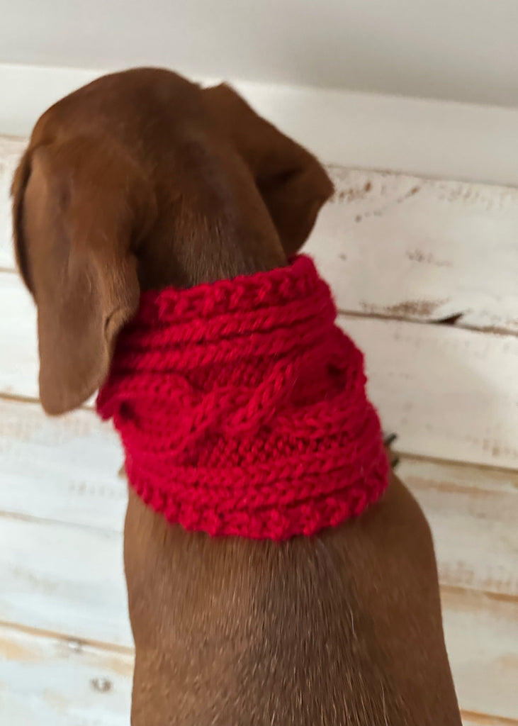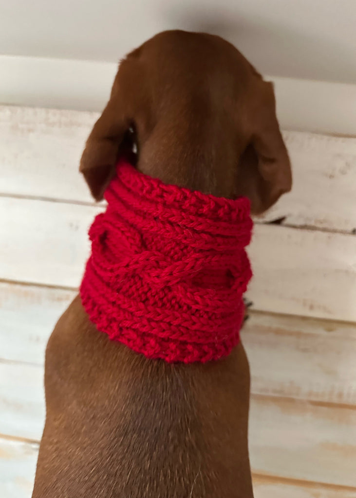 All our Aran Knitted Snoods are designed to fit dachshunds with neck sizes between 25–32cm. Thanks to the nature of the knit, there's a bit of natural stretch for a comfortable fit.