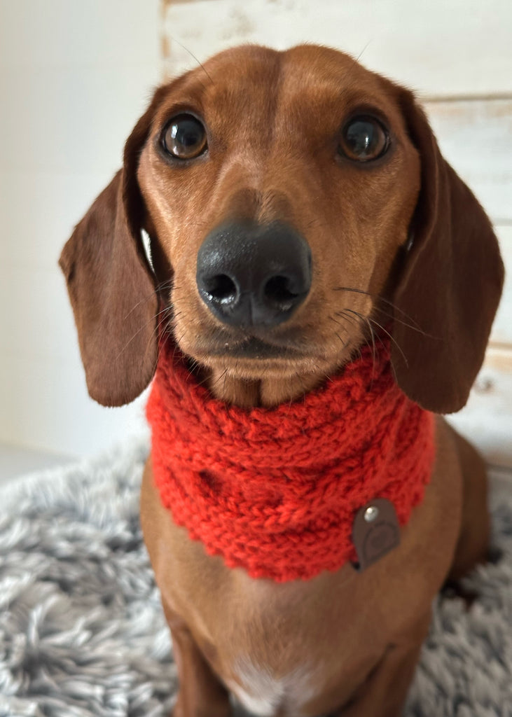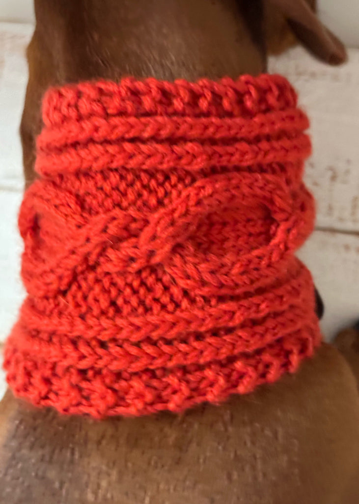 All our Aran Knitted Snoods are designed to fit dachshunds with neck sizes between 25–32cm. Thanks to the nature of the knit, there's a bit of natural stretch for a comfortable fit.