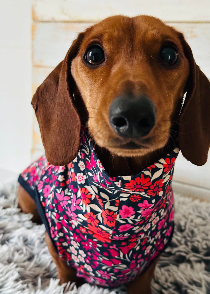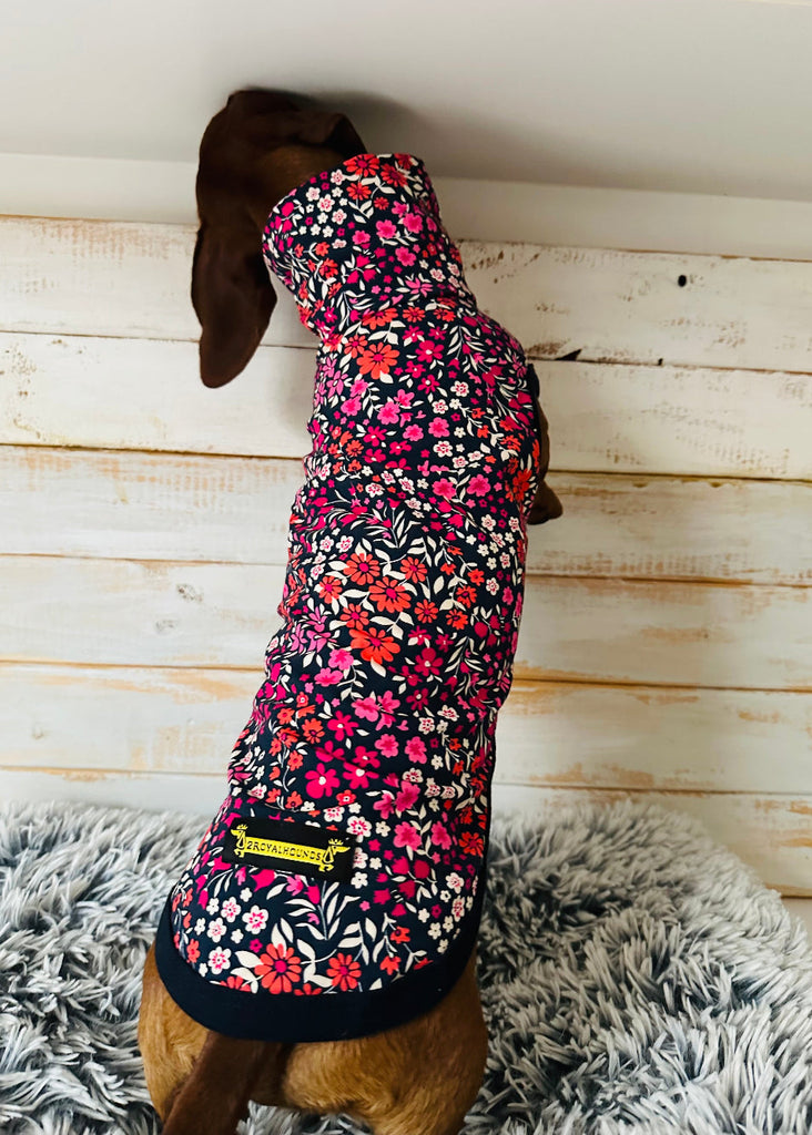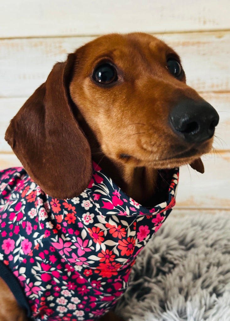 Specially tailored for dachshunds, the fit flatters long bodies and gives short legs complete freedom of movement. The delicate floral print brings a touch of romance and timeless charm, making it as stylish as it is comfortable.