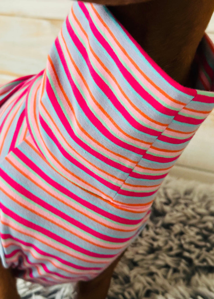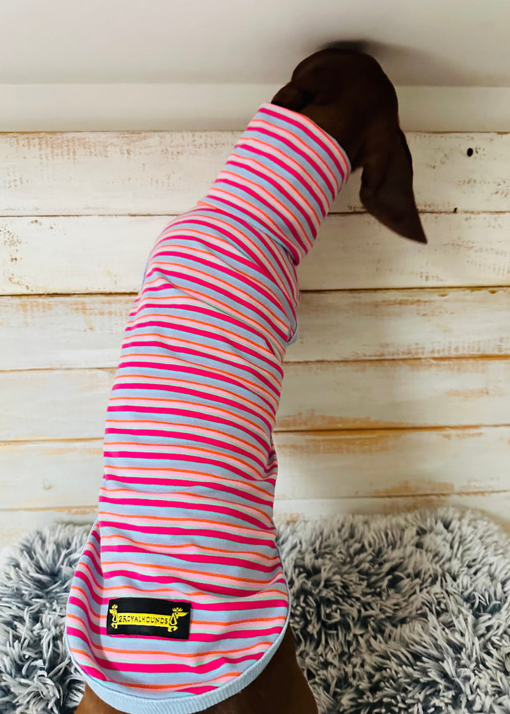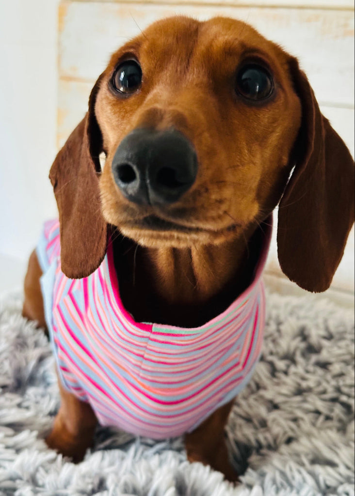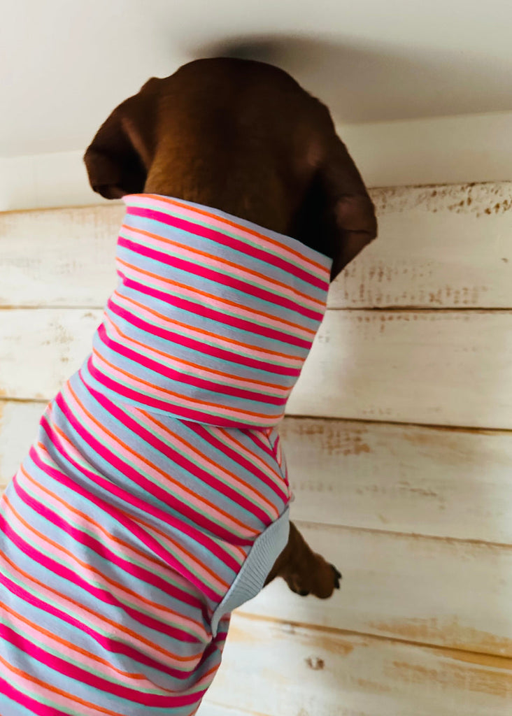Specially tailored for dachshunds, the fit hugs long bodies while giving short legs the freedom to move with ease. The pastel rainbow stripes in pink and blue bring a sweet, whimsical charm, making this tee as delightful to look at as it is to wear.