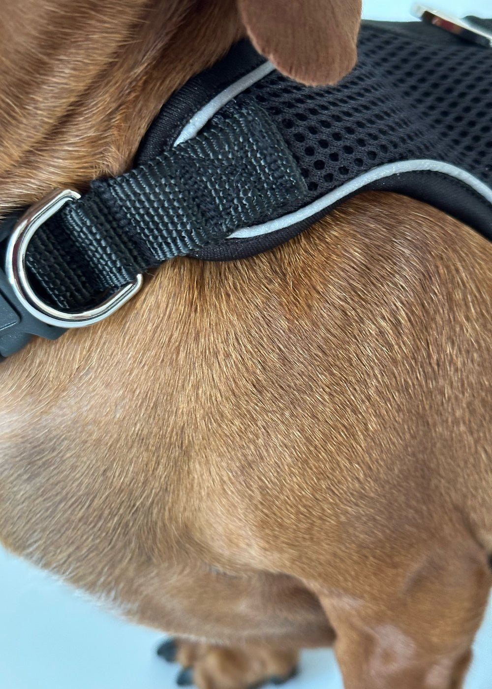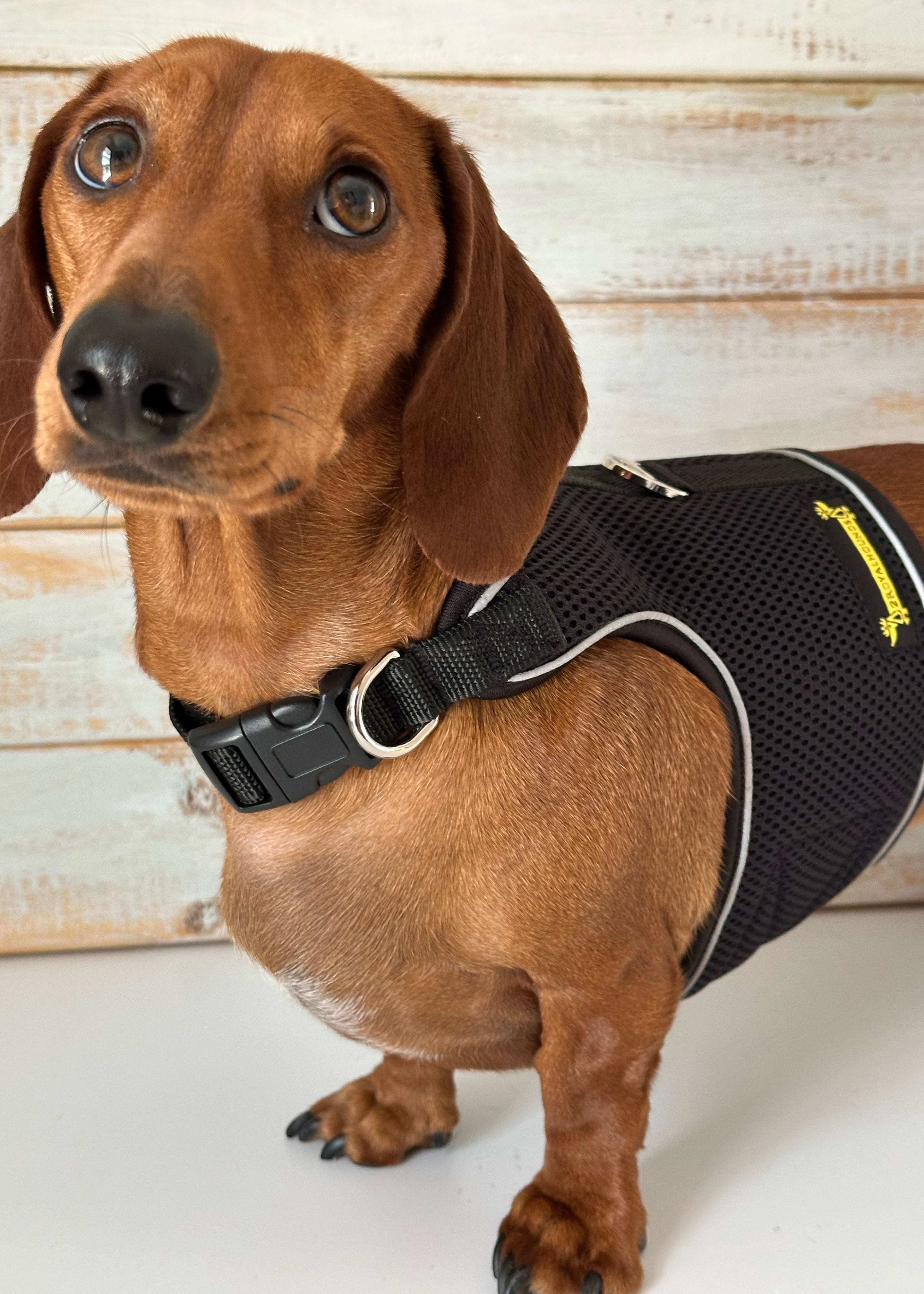 Elevate your pup’s look with the sleek and sophisticated Liquorice Black OxyMesh Hug Me Harness. Designed for comfort, safety, and timeless style, this harness is perfect for dachshunds and small dogs who love to stay classy while adventuring.