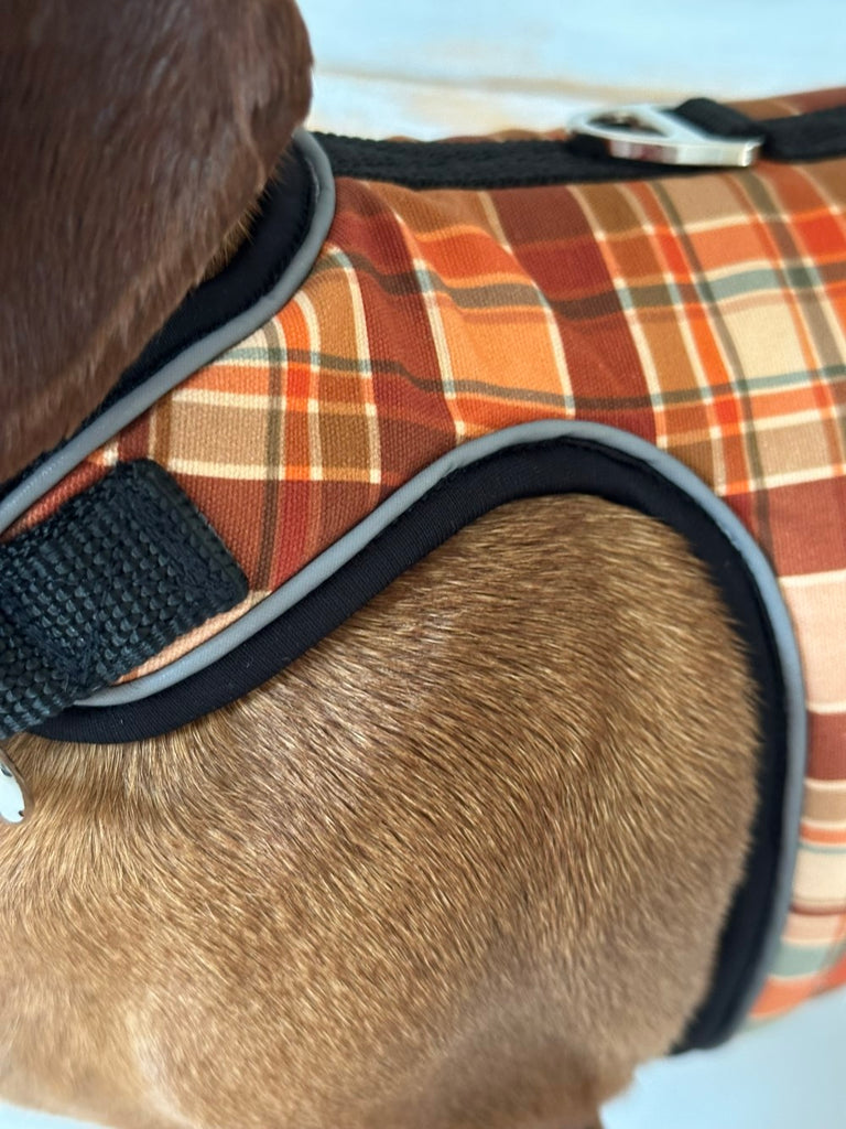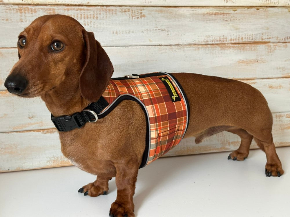 The Rusty Plaid Hug Me Harness™ blends rich burnt-orange hues with a timeless plaid pattern, creating a classic countryside look for stylish dachshunds. With its rugged charm and warm autumn palette, this design delivers effortless style for pups who love the outdoors from farm tracks to city paths with country flair.