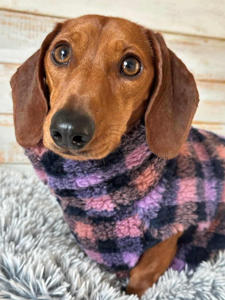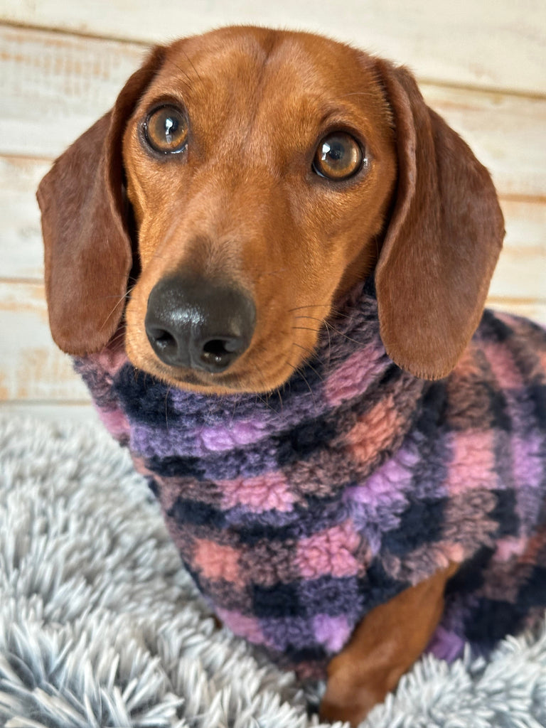 The nature of this fabric is more of a stretched and relaxed, soft, cosy and warm feel so consider this when ordering for your dachshund.  Measure up your dachshund as per the size guide to ensure that you order the correct sizing.  You may need to size down based on measurements.